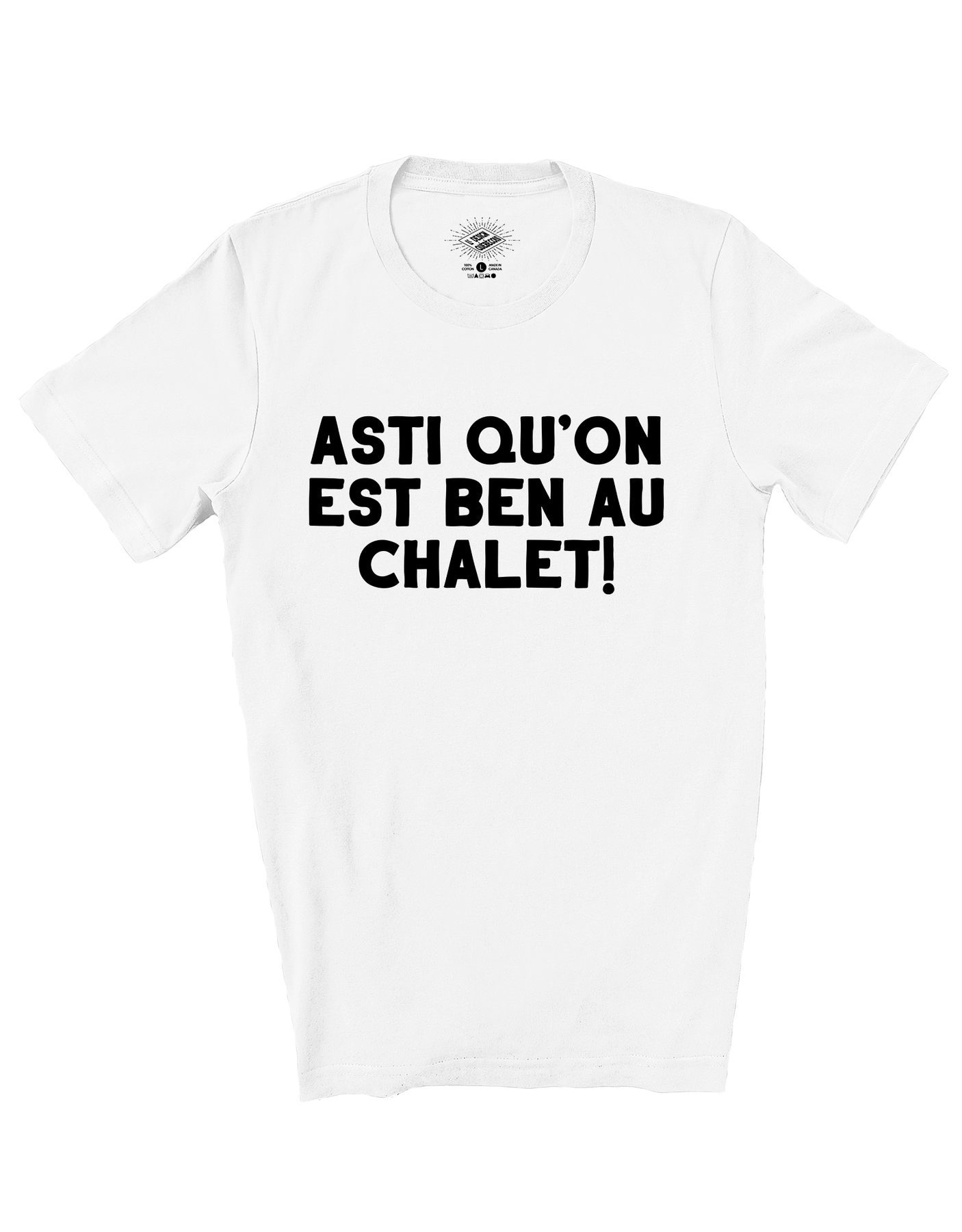 Le t-shirt Asti Qu'on Est Ben Au Chalet! Unisexe, pour homme et femme.
