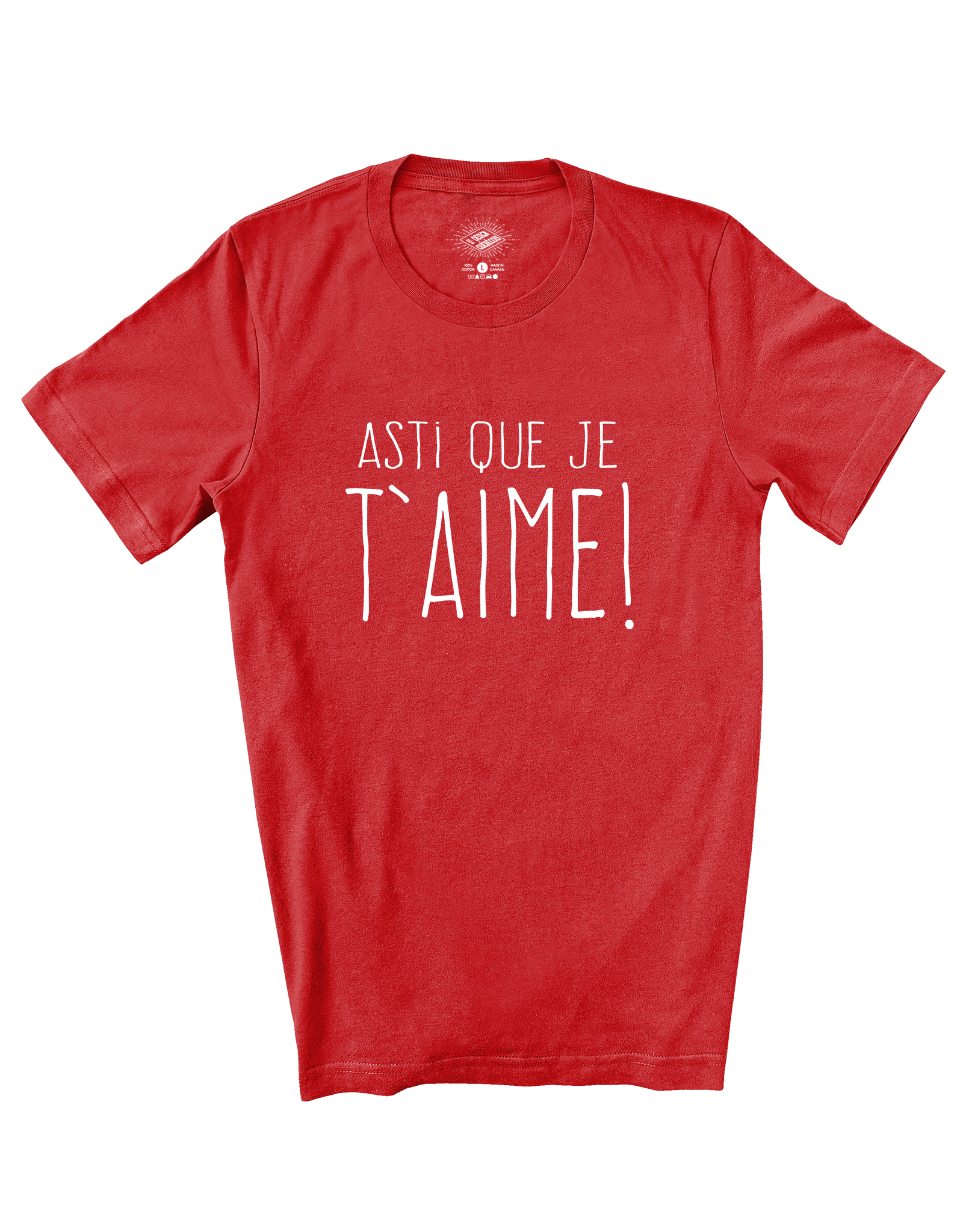 Le t-shirt Asti Qu'on Est Ben Icitte. Unisexe, pour hommes et femmes.